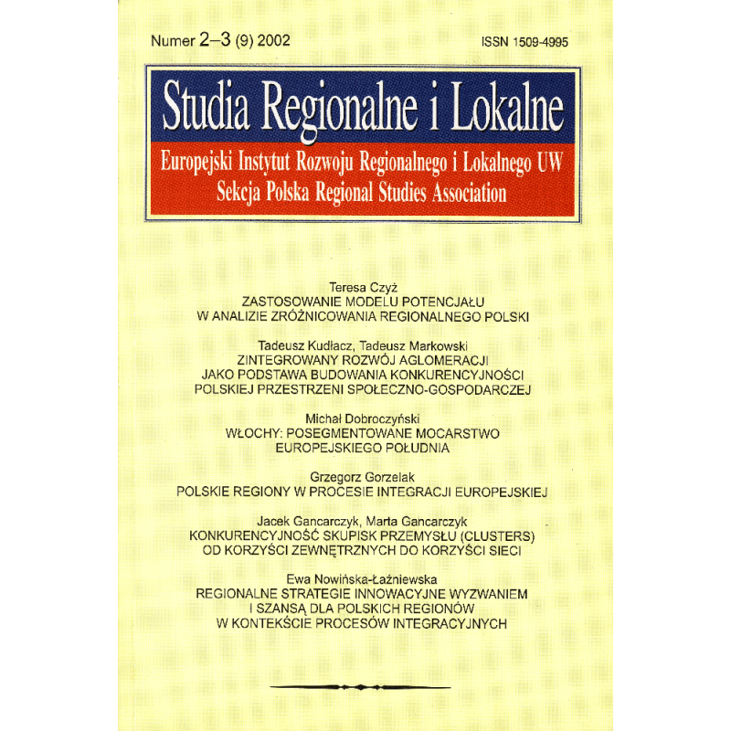 Teresa Czyż: Zastosowanie modelu potencjału w analizie zróżnicowania regionalnego Polski; Tadeusz Kudłacz, Tadeusz Markowski: Zintegrowany rozwój aglomeracji jako podstawa budowania konkurencyjności polskiej przestrzeni społeczno-gospodarczej; Michał Dobroczyński: Włochy: posegmentowane mocarstwo europejskiego Południa; Grzegorz Grzelak: Polskie regiony w procesie europejskiej; Jacek Gancarczyk, Marta Gancarczyk: Konkurencyjność skupisk przemysłu (clusters) - od korzyści zewnętrznych do korzyści sieci; Ewa Nowińska-Łaźniewska: Regionalne strategie innowacyjne wyzwaniem i szansą dla polskich regionów w kontekście procesów integracyjnych; Wojciech Dziemianowicz, Mikołaj Herbst: Rola granicy państwa w rozwoju obszarów przygranicznych - przykład Terespola; Karol Olejniczak: Rola położenia przygranicznego w rozwoju lokalnym - przykład miasta Sejny; Maciej Smętkowski: Rola położenia przygranicznego w rozwoju lokalnym - przykład Przemyśla; Tadeusz Truskolaski: Uwarunkowania rozwoju przedsiębiorczości w aspekcie polityki intraregionalnej w województwie podlaskim; recenzje.